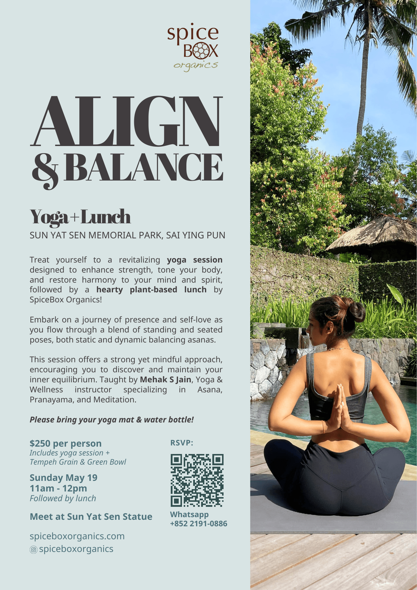 Treat yourself to a revitalizing yoga session designed to enhance strength, tone your body, and restore harmony to your mind and spirit, followed by a hearty plant-based lunch by SpiceBox Organics!