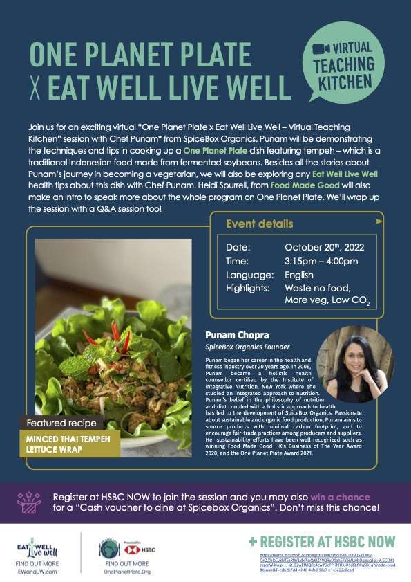 Join us for an exciting virtual “One Planet Plate x Eat Well Live Well – Virtual Teaching Kitchen” session with Chef Punam* from SpiceBox Organics. Punam will be demonstrating the techniques and tips in cooking up a One Planet Plate dish featuring tempeh – which is a traditional Indonesian food made from fermented soybeans. Besides all the stories about Punam’s journey in becoming a vegetarian, we will also be exploring any Eat Well Live Well health tips about this dish with Chef Punam. Heidi Spurrell, from 食品很好的 will also make an intro to speak more about the whole program on One Planet Plate. We’ll wrap up the session with a Q&A session too!